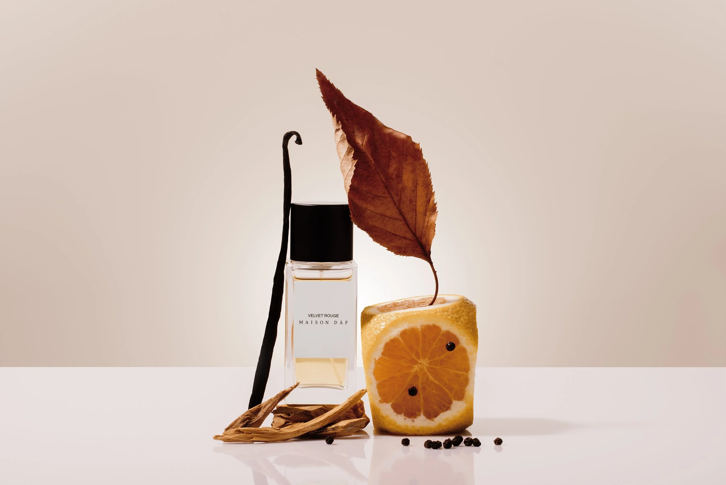 A clear glass perfume bottle with a black cap, labeled 'Velvet Rouge Maison D�e2f,' set against a gradient golden-brown background.